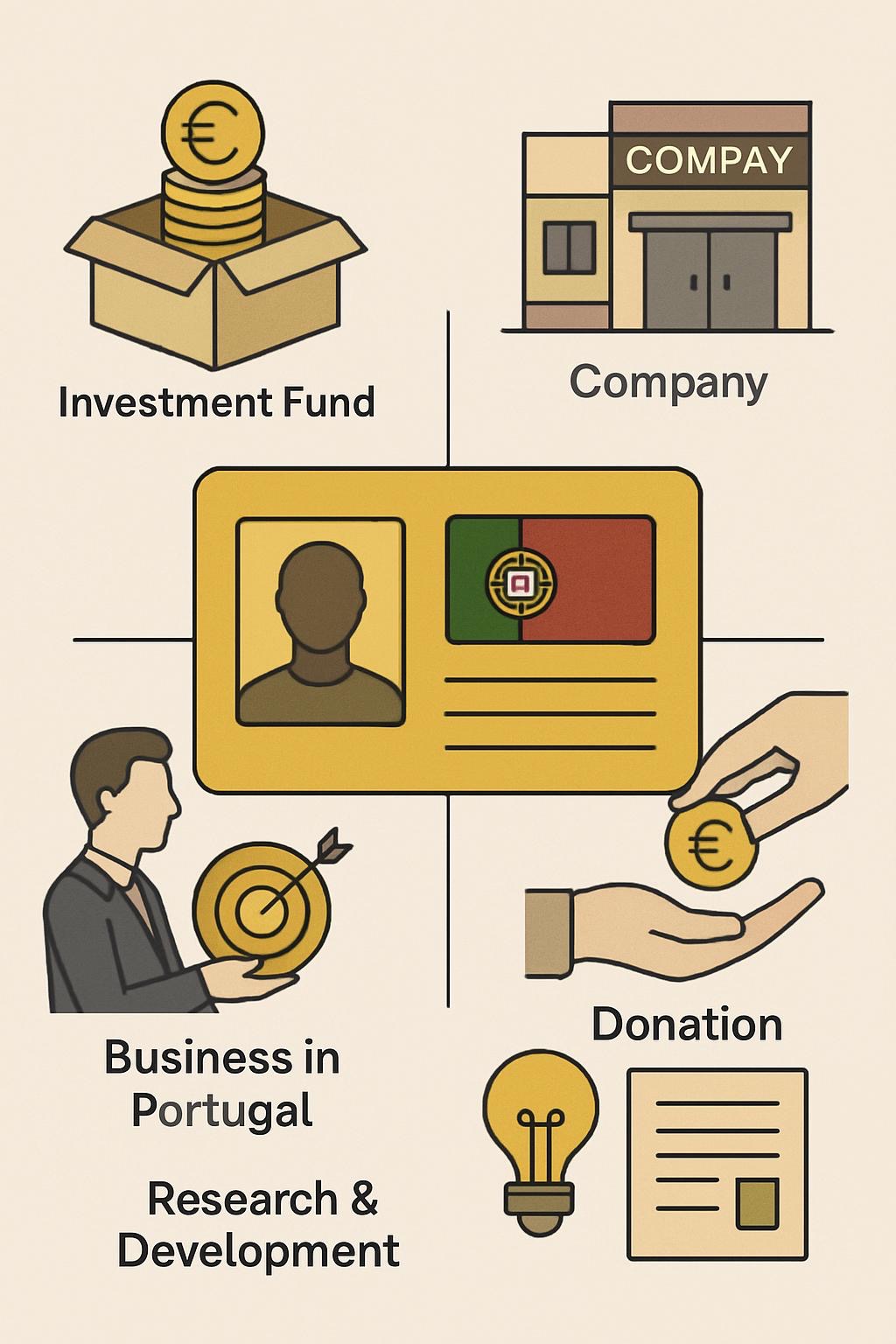 برای واجد شرایط بودن برای گذرنامه طلایی پرتغال، باید یک سرمایه‌گذاری واجد شرایط انجام شود. دسته‌های سرمایه‌گذاری شامل صندوق سرمایه‌گذاری خطرپذیر، تشکیل شرکت، مسئولیت‌های کارفرما و کمک مالیاست.